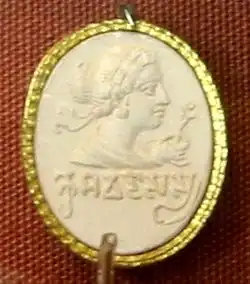 The "Kanishka casket", dated to the first year of Kanishka's reign in 127 CE, was signed by a Greek artist named Agesilas, who oversaw work at Kanishka's stupas (caitya), confirming the direct involvement of Greeks with Buddhist realizations at such a late date.[24][25][26][27][28]