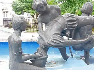 According to the story, Salcedo died in 1511, during a trip to Puerto Rico, when Taínos, under the command of Agüeybaná II (brother of the great Taino Cacique Agüeybaná) and the Cacique of Añasco, Urayoán, drowned him in the Río Grande de Añasco.[2] Historically, two versions about how Salcedo was lured to his death have collided. Many books assert that the soldier had been told he'd be taken to a lake filled with Taíno women that he could have sex with, and, once there, he found not women, but men who then proceeded to drown him. The other version has Salcedo being offered a ride across a river by Taínos who carried him on their arms, and then drowned him and kept him for days, afraid he'd still be alive and waiting until they were certain he was dead.[3]