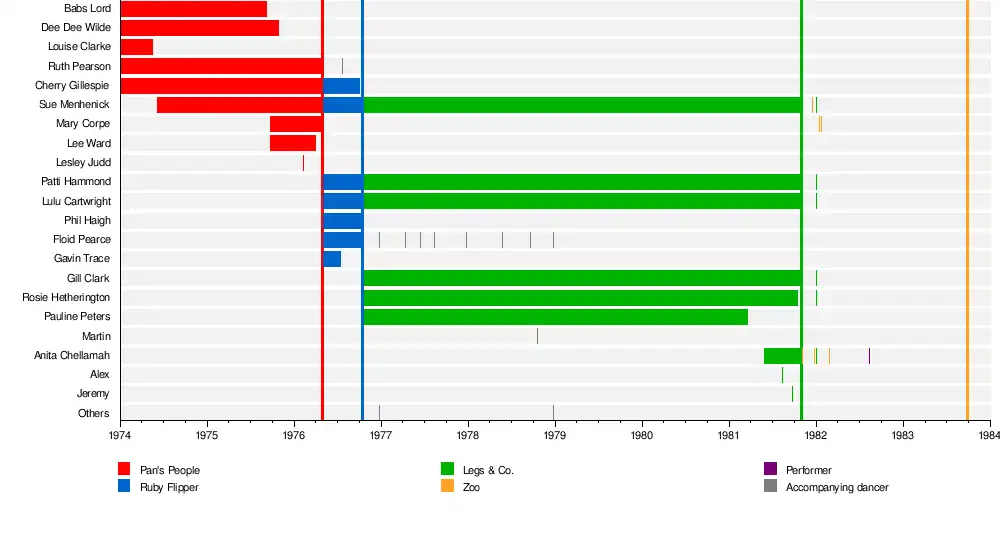 The following displays the timeline for Top of the Pops dancers between 1974 and 1983, showing the transition of dancers between the troupes. This is a complete list, with the following exceptions and notes: