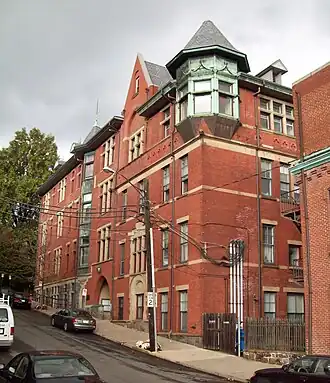 A red brick building set on a stone masonry base, this historic structure was built by the Lehigh Valley Railroad in two stages; the ground through third floors were constructed between 1885 and 1886, and the upper floors and western wing were added between 1889 and 1890. The building's style reflects Late Victorian Gothic and Queen Anne influences.