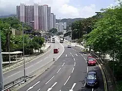 Lei Muk Shue Estate (Chinese : 梨木樹邨 ) is a public housing estate in Sheung Kwai Chung , Tsuen Wan , New Territories , Hong Kong, near the exit of Shing Mun Tunnels . It is the largest public housing estate in the Tsuen Wan District , with a population of 28,100 as of December 2021.[ 1] Although it is geographically located in Sheung Kwai Chung (literally means "Upper Kwai Chung"), administratively it belongs to the Tsuen Wan District[ 2] instead of the Kwai Tsing District because it is at the west of Wo Yi Hop Road, the boundary between the two districts.