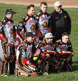 2011 Riders signed for the start of the 2011 season were Sergey Darkin, Ilya Bondarenko, Jamie Courtney, Jan Graversen, John Oliver, Richard Hall (on loan from Sheffield Tigers), and Richard Sweetman (on loan from Swindon Robins).[20] Mathieu Trésarrieu was brought in when Bondarenko was out through injury. By July 2011, four of the seven riders who started the season had either left or been replaced, with only Bondarenko, Graversen and Oliver remaining, and Hemsley had handed over team management duties to Jason Attwood. Promoter Hemsley brought in Kauko Nieminen, Henning Bager and Magnus Karlsson, with Charles Wright and Ashley Morris as reserves. In August, Oliver and Wright were released, with Viktor Bergström and Jason Garrity coming in for the remainder of the season. Graversen finished the season as the team's top points scorer with 211 points from league and cup matches. 2012 In November 2011, Graversen and Karlsson were the first riders confirmed for the 2012 season,[21] with Jari Mäkinen the third signing. At the end of November Nieminen signed to return in 2012 and the top three in the 2012 team was completed by Danish Under-21 Champion Lasse Bjerre. Sixth rider to be signed was Simon Lambert. The team was completed by Simon Nielsen. An injury for Neilsen early in the season saw Kyle Hughes drafted in as a temporary replacement and a broken femur for Nielsen later in the season led to the signing of Linus Eklöf, with Lambert leaving to accommodate the Swede's higher average, and Lewis Blackbird moving up from the National League to complete the new line-up. Lions again finished as runners-up (this time to Berwick Bandits) in the Premier Fours. 2013 The team for 2013 was announced, subject to BSPA approval, on 25 November 2012. Nieminen, Bjerre, Graversen, Nielsen, and Blackbird were joined by Kevin Doolan and Adam Roynon. An injury to Roynon after only one match for the Lions saw the return of Magnus Karlsson to the team.[22] Despite scoring at over a point above his starting average, Blackbird was allowed to leave for Scunthorpe Scorpions in May after the signing of Robert Branford.[23] Later that month, Nielsen lost his place to Alex Edberg. Branford was replaced by James Sarjeant in July and with two league matches to go Sarjeant and the injured Nieminen were replaced by Simon Nielsen and Linus Eklof.[24] 2014 At the BSPA AGM in November 2013 the Lions were accepted into the Elite League for 2014.[25] The first two riders for 2014 were confirmed in early December when Tom Perry and Max Clegg were picked in the reserve draft.[26] Mads Korneliussen, Patrick Hougaard, Peter Ljung, and Jason Doyle were named in the top five of the side, but doubts over Doyle's visa delayed the completion of the team. With Doyle receiving a tier 5 visa, his place was confirmed, and Simon Stead was named in the final team place.[27] Norrie Allan was named as team manager, with former manager Glyn Taylor concentrating on track curation. In May Ljung withdrew from racing in Britain and was replaced by Lasse Bjerre. Perry was replaced by Josh Bates. An injury to Hougaard led him to withdraw from British speedway, and Lions brought in Krzysztof Buczkowski and Nicolai Klindt, with Bjerre losing his place. 2015 The first rider signed for 2015 was Polish Under-21 champion Szymon Woźniak. They then selected Josh Auty and Simon Lambert in the reserve draft.[28] Jason Doyle returned for a second season, and former Eastbourne Eagles rider Mikkel Michelsen also signed. Bjarne Pedersen and Grzegorz Walasek completed the team. Pedersen and Michelsen had both left by May, with Lewis Bridger and Sam Masters replacing them, although Bridger quit after only one meeting. 2016 With Lions' Saturday race night prompting 2015 number one Doyle to leave, Lions retained Walasek, Woźniak, and Auty from the previous season's team, also signing Paul Starke at reserve. Former rider Nikolai Klindt returned, but by late January they were still short of two heat leaders, with team manager Norrie Allan admitting "We need two riders of heat leader standard, and there just aren't any out there...we could be looking at putting in two riders just to complete a team."[29] They eventually signed Sebastian Ułamek and Patrick Hougaard, starting the season over 4 points below the team building limit. After losing the first four league meetings, Walasek was dropped, to be replaced by Aaron Summers. An injury to Ułamek saw him being replaced by Davey Watt.[30] 2019 The Leicester Lion Cubs first two signings for the season were the Thompson twins Dan and Joe as their reserves.[31] Ellis Perks was confirmed as the third signing for the Lion Cubs, he would start the season at number 1 and also double up with the first team Leicester Lions.[32] On 18 December 2018, the Lion Cubs announced their next two signings which were Danyon Hume (as captain) and Kelsey Dugard, [33] with the final two signings confirmed as Luke Ruddick and Jamie Halder.[34] On 3 January 2019, Leicester confirmed they would be managed by club co-promoter Dave Darcy and he would be assisted by David Howard.[35] Danyon Hume was later named as team captain, on 31 January.[36] Kelsey Dugard was injured following injuries suffered in a crash during the Leicester Press and Practice day on 15 March and was replaced by Ryan MacDonald. On 28 October 2019, the Lion Cubs won the title after home and away victories in the play-off final against Kent Kings, and on the following evening (29 October) they completed the League and Cup double by winning the National League Knockout Cup with an aggregate victory in the final over the Belle Vue Colts. 2020-2021 After a Challenge match victory away at Scunthorpe 61-53 in their only meeting in the COVID-19 hit 2020 season, the Lion Cubs built a new team for the 2021 National Development League speedway season, with the team building points limit reduced to 35 with a new League focus on youth development. Only Dan and Joe Thompson return