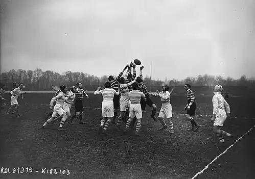 Tigers first televised game by the BBC was on 3 February 1951 when they beat London Scottish 14–0 at the Richmond Athletic Ground.[17] The club underwent a significant restructure in the 1956–57 season. The practice of being an "invitation" club featuring only a First XV stopped and Tigers adopted a more traditional membership club based approach with multiple sides. The "A XV" was to be re-introduced under the name "Extra First XV" with a third "Colts XV" also formed.[18] The 1963–64 season saw David Matthews set the record for most consecutive appearances for the club with 109.[19] Matthews was to become captain in 1965 and in 1966/67 lead the club to a record 33 wins.[20] Chalkie White became coach in 1968; the same season Tom Berry became Leicester's first President of the RFU. White was credited with revolutionising Leicester's players in response to rule changes that opened up the game. 1970/71 saw Peter Wheeler emerge as first-choice hooker having made his debut the year before, he ended the season on England's tour to the Far East. Attendance for the annual Barbarians game hit a nadir with a crowd of only 2,518.[21]