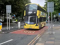In February 2019, TfGM were successful in bidding for funding support in buying an additional 10 electric buses for busway operation, to enter service in March 2020.[26] These are Alexander Dennis Enviro400 MMC double-deckers with BYD Company battery power. TfGM intend that eventually all Vantage services will be operated by electric buses; to be purchased and owned by TfGM themselves, rather than by the service operator. Five of the existing fleet of Volvo B5LH buses were be transferred to other services in Greater Manchester; and so total busway-equipped fleet increased to 30, allowing extra daytime frequency on V1 services from Leigh. But that never happened.[27]