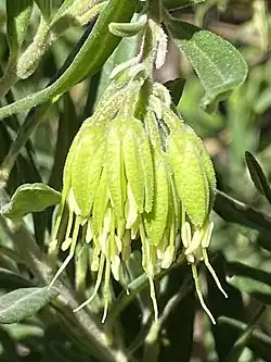 Leionema viridiflorum is usually a small shrub to 1 m (3 ft 3 in) high with more or less needle-shaped stems covered in star-shaped, short, matted hairs. The leaves are mostly erect, narrowly oblong to oblong-elliptic, 20–40 mm (0.79–1.57 in) long, 4–8 mm (0.16–0.31 in) wide, wedge shaped at the base, apex lobed, smooth margins, rolled under or upward when dry, upper surface dotted with glands with occasional smooth to star-shaped hairs, underside more or less covered in star-shaped hairs. The inflorescence is a cluster of 6-12 pendulous flowers on a stalk 4–8 mm (0.16–0.31 in) long at the end of branches. The calyx are fleshy and hemispherical shaped. The erect, pale yellow-greenish petals are lance to narrowly oblong shaped, about 10 mm (0.39 in) long with occasional star-shaped, soft, erect hairs and the stamens twice the length of the petals. The fruit are a capsule, each segment about 6 mm (0.24 in) high, ending with a short beak. Flowering occurs from winter to early spring.[2][3]