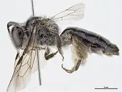 Hairs on young males are often orange, fading as they age.[7] Females carry pollen externally on scopae.[7]