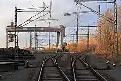 Leipzig-Wahren station did not receive a central signal box, only a signal box at its exit with a track-diagram relay interlocking of the GS II DR type. Also, colour-light signals were not installed throughout the station and were essentially only used as entry signals and on the passenger tracks. Electrodynamic track brakes were installed on the marshalling-yard hump.
