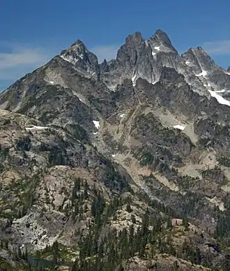 During the Pleistocene period dating back over two million years ago, glaciation advancing and retreating repeatedly scoured the landscape leaving deposits of rock debris.[6] The last glacial retreat in the Alpine Lakes area began about 14,000 years ago and was north of the Canada–US border by 10,000 years ago.[6] The U-shaped cross section of the river valleys is a result of that recent glaciation. Uplift and faulting in combination with glaciation have been the dominant processes which have created the tall peaks and deep valleys of the Alpine Lakes Wilderness area.
