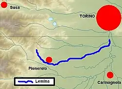 Lemina source is at 1,382 m above sea level at Monte Faiè, a peak of Monte Freidour in the central Cottian Alps, at the boundary between the communal territories of Pinerolo and San Pietro Val Lemina. It flows for some 46 km, until entering the Chisola near the communes of La Loggia and Vinovo, some kilometers east to Turin.
