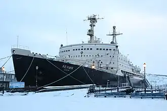 Lenin (Russian: Ленин) is a Soviet nuclear-powered icebreaker, the first nuclear-powered icebreaker in the world. Launched in 1957, it is both the world's first nuclear-powered surface ship[2] and the first nuclear-powered civilian vessel. Lenin entered operation in 1959 and worked clearing sea routes for cargo ships along Russia's northern coast. From 1960 to 1965 the ship covered over 157,000 kilometres (85,000 nautical miles) during the Arctic navigation season, of which almost 120,000 km (65,000 nmi) was through ice.[2] Nuclear power proved to be an ideal technology for a vessel working in such a remote area as it removed the need for regular replenishment of fuel. On 10 April 1974 the vessel was awarded the Order of Lenin. It was officially decommissioned in 1989.[1] It was subsequently converted to a museum ship and is now permanently based at Murmansk.
