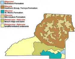 The Pliocene (~5.332—2.588 Ma) is represented by the Miccosukee Formation scattered within the Torreya Formation.