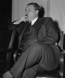 Henderson worked as an economic adviser in President Franklin Roosevelt's administration before he was appointed to the Securities and Exchange Commission in 1939.[6] In 1941 he became head of the Office of Price Administration. His tenure there was controversial and he was deeply unpopular, especially with farmers.[7] Edwin W. Pauley, secretary of the Democratic National Committee in 1942, listed five factors for Democratic losses in the 1942 election, and resentment of Leon Henderson was listed as one of the top five reasons for that defeat. As he wrote, "This was the most universal and serious complaint of all ... It appears from the letters that the complaint is directed rather at Mr. Henderson and his attitude and methods than at the abstract question of ... rationing and price control."[8] Those losses ensured that no more New Deal social measures would be passed by the US during World War II, and that many of them would be repealed.