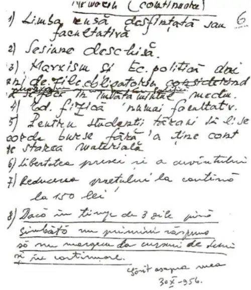 The tensions between Gheorghiu-Dej and Khrushchev, who had risen to a paramount position in the Soviet Union, were highlighted during the Hungarian revolution of 1956. Romania participated in the punitive expedition against Hungary. Răutu himself reported that the general public felt that Romania suffered "because of the terrible boners made by the Soviets in Hungary."[124] Documenting the reorientation of the mid-1950s, scholar Ken Jowitt included Răutu and Gheorghiu-Dej's economic adviser, Alexandru Bârlădeanu, among the PMR "regime figures" who mediated "between the progressives and the Stalinists."[125] When Gheorghiu-Dej, who played the two factions against each other, decided to overturn some of the Zhdanovist measures adopted in the 1950s, he even described Răutu and Roller as responsible for the PMR's frail relationship with the Romanian intellectuals.[126]
