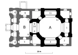 The central part of the church is designed in early baroque style with anteroom, diagonal side rooms and a surrounding gallery. The facade is double-towered creating a striking effect at the distance.[8]