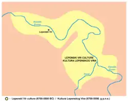 Lepenski Vir (Serbian Cyrillic: Лепенски Вир, "Lepena Whirlpool"), located in Serbia, is an important archaeological site of the Lepenski Vir culture (also called as Lepenski Vir-Schela Cladovei culture[2]). It includes Mesolithic Iron Gates Hunter-Gatherers period and transition to Early Neolithic Early European Farmers period of the Balkans.[2]
