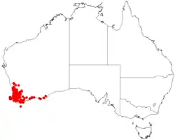 The species is found in the Southwest Australia region, in a variety of soil types. They occur on slopes, on black and grey sands, lateritic and peaty soils, or clay, and on gravel.[1]