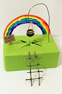 A leprechaun trap is a children's craft project used to celebrate Saint Patrick's Day in the United States.[1] The traps are traditionally made by young children and set out the night before St. Patrick's Day.[1] The following morning, the children awaken to discover signs that leprechauns (mythical creatures from Irish legends) have visited the trap. After the children go to sleep, parents add signs of a leprechaun visiting, such as chocolate coins or treasure left in their bottom drawers, and pretend that a leprechaun did it.[2]