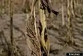 Phoma black stem infections can occur throughout the growing season, although the lesions are more noticeable during late summer. Phoma macdonaldii can be transmitted via rain splash or by stem weevil feeding. The fungus can either penetrate into the plants either directly via enzymatic degradation of the plant cell wall or by mechanical pressure.[5] The fungus overwinters in infected crop debris either inside of pycnidia or as mycelium.[6] Primary inoculum originates from overwintering fungal structures (perithecia, pycnidia, and mycelia).[5] Conidia (from pycnidia) and ascospores (from perithecia) are released from fruiting structures and subsequently dispersed by rain and wind. Disease development is favorable in wet conditions during flowering stage and immediately after flowering stage. Stem weevils transmit the fungus directly by their feeding behaviors.[2]