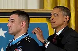 Petry received the Medal of Honor from U.S. President Barack Obama on July 12, 2011, in a ceremony at the White House. He is the second living recipient of the medal, after Army Staff Sergeant Salvatore Giunta, for actions occurring after the Vietnam War. He is the ninth recipient for actions in Iraq or Afghanistan.[14] Giunta was in attendance at the awarding ceremony.[12] Petry later in 2011 attended the Medal of Honor ceremony of U.S. Marine Sergeant Dakota Meyer, the third living recipient of the medal since Vietnam.[15]
