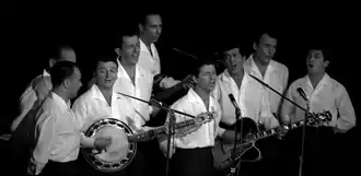 The line-up of Les Compagnons changed over time, but for a large part of their career they had nine members: three tenors, three baritones and three basses,[12] with Fred Mella their principal tenor soloist. In the beginning they usually performed a cappella or with a guitar or another instrument, later performances also included orchestral accompaniment.[13][14]