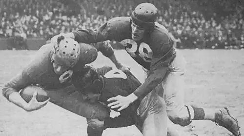 Redskins end Dye (#38) comes over the top to help teammate Leo Presley bring down Bill Paschal of the New York Giants, Oct. 28, 1945.