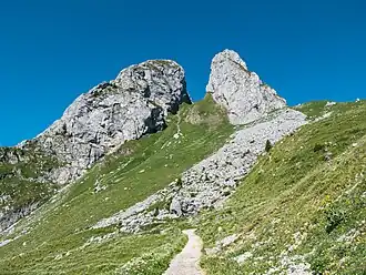 Les Jumelles (French pronunciation: [le ʒymɛl]) is a mountain in the Chablais Alps, overlooking Taney in Valais. It has two distinct summits, the highest (Grande Jumelle) being 2,215 m (7,267 ft) high and the lowest (Petite Jumelle) being 2,182 m (7,159 ft) high.