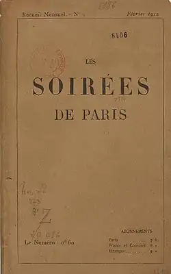Les Soirées de Paris was a French literary and artistic review founded in February 1912 by Guillaume Apollinaire and four of his associates - André Billy, René Dalize, André Salmon, and André Tudesq. It was last published in August 1914.[1]