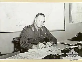 Beavis was promoted to colonel within weeks of the commencement of the Second World War and joined the Second Australian Imperial Force (AIF) in 1940. He served in the Middle East on the staff of Lieutenant General Sir Thomas Blamey, the commander of the AIF, holding a number of supply related positions. Promoted to the temporary rank of brigadier in December 1940, he was successful in a new role of director of ordnance services.[1] This led to his appointment as a Commander of the Order of the British Empire in 1942.[7] Promoted to temporary major general in April 1942, he returned to Australia to succeed Major General Edward Milford in the position of master-general of the ordnance. He was tasked with co-ordination of private and government manufacturers and producers to provide logistic support for Australia's soldiers, both at home and overseas. As the war came to a close, he found his work becoming more difficult as Australia began to move away from a wartime footing.[1]