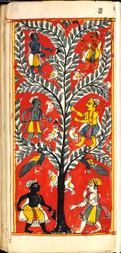 The Jain texts further describe the mental dispositions of a soul on account of leśyās with an example of the reactions of six persons who are travelers, on seeing a fruit-bearing tree. They see a tree laden with fruits and begin to think of getting those fruits: one of them suggests uprooting the entire tree and eating the fruits; the second one suggests cutting the trunk of the tree; the third one suggests cutting the branches only; the fourth one suggests cutting the twigs; the fifth one suggests plucking the fruits only; the sixth one suggests picking up only the fruits that have fallen down. The thoughts, words and bodily activities of each of these six travellers are different based on their mental dispositions and are respectively illustrative of the six leśyās. The person with the black leśyā, having evil disposition, thinks of uprooting the whole tree even though he wants to eat only one fruit. The person proposing to cut the tree trunk has blue leśyā, the one suggesting cutting branches has grey leśyā, the person suggesting cutting twigs has red leśyā and the person thinking of simply plucking the fruits has yellow leśyā. On the other hand, the person with the white leśyā, having pure disposition, thinks only of picking up fruits fallen on the ground sparing the tree.[6]