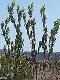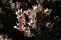 The shrub grows 3 m (9.8 ft) tall and flowers in August. The plant dies in a fire but the seeds survive. The seeds are stored in a toll on the female plant and fall to the ground after a fire and are spread by the wind, the seeds have wings. The plant is unisexual and there are separate plants with male and female flowers, which are pollinated by insects. The plant's national number is 81.2.[2]