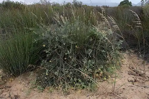 Leucospermum arenarium is a lax, evergreen shrub, with arching and drooping branches, that has been assigned to the family Proteaceae. It has loosely spaced, upright, greyish, narrowly egg-shaped to line-shaped leaves, mostly without teeth and flattened globe-shaped flower heads of 5–7 cm (2–2¾ in) across, consisting of mostly creamy, seldom yellow flowers, that curve in the bud to the center of the head. From the center of the flowers emerge curved styles that jointly give the impression of a pincushion. The common name in English is Redelinghuys pincushion.[3] It only occurs in a very small area in the Western Cape province of South Africa. It flowers between July and October.[2] Unlike in related species the flowers are pollinated by hairy-footed gerbils and striped field mice.[4]