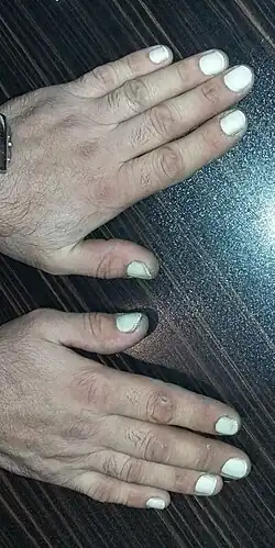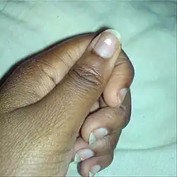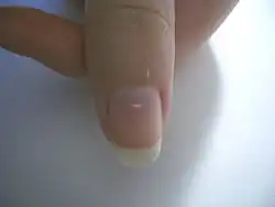 Leukonychia (or leuconychia) is a medical term for white discoloration appearing on nails.[2] It is derived from the Greek words leuko 'white' and onyx 'nail'. The most common cause is injury to the base of the nail (the matrix) where the nail is formed.