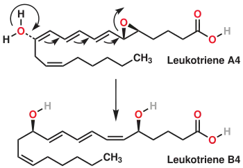 Leukotriene A4 Hydrolase catalyzes the reaction which converts leukotriene A4 to leukotriene B4. The Leukotriene A4 structure contains an epoxide ring functional group, which are highly reactive due to its ring strain making them extremely electrophilic. This drives the reaction forward, favouring the products Leukotriene B4. Leukotriene A4 hydrolase adds a water molecule across the epoxide ring on Leukotriene A4. The addition of the water molecule opens the epoxide ring and causes the formation of the Hydroxy group at the carbon attached to the oxygen from the epoxide. The second carbon involved in the epoxide ring remains the same resulting in leukotriene B4. The water molecule attacking the double bond also forms into a hydroxy group after work-up. The product of the reaction is Leukotriene B4.