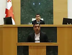 Being on the electoral list of UNM,[30] he ended up a member of Parliament regardless of his loss in Sighnaghi. There, he served as deputy chairman of the UNM faction, deputy chair of the Legal Issues Committee, and a member of the Economic Policy Committee. He was also a member of the 2013 special investigative committee set up to investigate the National Communications Commission after two service providers blew the whistle on potential abuses of power and conflicts of interest within the Commission. He served as a member of the Constitutional Commission of 2013–2016.[2] One of the most vocal opposition lawmakers, he announced his party's walkout from parliamentary sessions on 27 June 2013 following the arrest of several Tbilisi city officials.[31] During a parliamentary hearing of Prime Minister Irakli Gharibashvili on 26 July 2014, he was engaged in a clash of words with the head of government after criticizing the Ministry of Finance for distributing high bonuses to government workers.[32]
