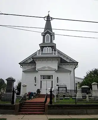 Lewes Presbyterian Church is a historic Presbyterian church building located at 100 Kings Highway in Lewes, Sussex County, Delaware. It was built in 1832, as a frame meeting house measuring 45 feet by 37 feet. In 1869, the church was renovated to add a number of a Gothic Revival style features and the addition of a chancel with Gothic windows. In 1886–1887, the tower and belfry were added and two massive Corinthian order columns were added to the interior. In 1931, the church acquired its Colonial Revival style front door.[2]