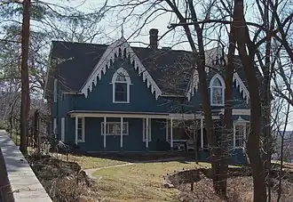It is a one-and-a-half-story "romantic" Gothic Revival cottage overlooking the St. Croix River. It has multiple steep gables "ornamented with finials and heavy elaborate wooden bargeboard with pendants."