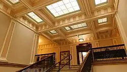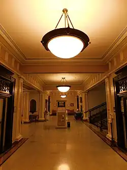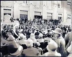 A fire in a first floor storage room used for waste paper began on the evening of September 25, 1931. Considered to be caused by a discarded cigarette or spontaneous combustion, no damage was reported and inmates in the jail cells were not harmed; the courthouse was ventilated by the city's fire department due to the excessive smoke.[92] In July 1934 during a mortgage foreclosure auction, a common event held at the courthouse during the Great Depression, a crowd gathered to protest the sale of a farm and the eviction of its owners. The assembly grew vocal and threatening enough that several law officers and the purchaser of the deed were hastily removed for their safety. Despite the growing crowd, no riot occurred.[93] Three members of the crowd were charged with inciting a riot and the case was heard at the courthouse at the end of the year.[94]