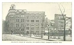 After the falling out between him and the society, Pease and his wife leased several buildings and established the Five Points House. Schools for children and adults were held and, supervised by Pease and his wife, workrooms were opened in which material was received from local clothing manufacturers to be made into cheap garments. His reputation and success grew and other reformers joined his cause. He also received generous donations from wealthy and prominent New Yorkers. The Five Points House of Industry was founded in 1854 and organized under a Board of Trustees with Pease elected as a member. He held the position of superintendent for eight years.[1] Its first building, a commodious home, was erected in Anthony Street two years later [2] and, in 1864, the old tenements in Cow Bay were purchased and torn down to build a larger mission house.[3] He and his wife later retired to a farm in Westchester, New York which was owned by the Five Points House of Industry and which taught farming and agricultural methods.[1]