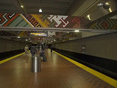 The concrete beams above the station platform are decorated with a ceramic mosaic created by Baltimore artist Patricia Alexander for a commission of $68,300.[4][5]