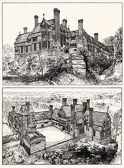 Leyswood (or Leys Wood or Leyes Wood) is an architecturally notable house in Groombridge, East Sussex, that was designed by Richard Norman Shaw, and completed in 1868.[1] It was a large mansion around a courtyard, complete with mock battlements, towers, half-timbered upper facades and tall chimneys – all features quite readily associated with Tudor architecture; in Shaw's hands, this less fantastical style achieved immediate maturity.[2]