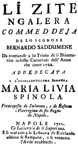 Li zite 'ngalera (The Newlyweds on the Galley)[1] is a commedia per musica in three acts by the Italian composer Leonardo Vinci, first performed at the Teatro dei Fiorentini, Naples, on 3 January 1722. The libretto, by Bernardo Saddumene, is written in the Neapolitan language which characterizes it as commeddeja pe mmuseca.