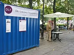 During the 1990s, some of the Progress Party's members considered the party to have become less liberal than it had been in its earlier days. These members of the Progress Party then decided to join the DLF.[2] The DLF then took increasingly more classically liberal viewpoints on most issues, emerging as a promoter of economic liberalism and laissez-faire capitalism. The party's politics states that the state should only protect individuals' rights through police, courts of law and a military service.