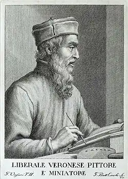 He was a pupil of the painter Vincenzo di Stefano, although he was strongly influenced by Andrea Mantegna and Jacopo Bellini. He was featured in the Vite of Giorgio Vasari. In Verona, he painted an Adoration of the Magi in the Duomo, and another for the chapel in the bishopric. For the church of San Bernardino, he painted in the chapel of the company of the Maddalena. He also painted a Birth and Assumption of the Virgin. At the Brera Gallery, there is a St. Stephen. There are illuminated books by him in cathedral of Chiusi. The St Sebastian in the Princeton University Art Museum is attributed to Liberale.[1] Between April and May 1476 Liberale left Siena to move again to Monte Oliveto Maggiore. On 22 June, still a guest of the archicenobium, he sent one of his 'soma' to Florence, perhaps intending to stay there for some time. It can only be assumed that in these circumstances he had made a definitive return to the north, since there is no further news of him until 9 Sept. 1481, when he signed an agreement with Nicolò Solimani to decorate the Tonso Chapel in the Servite Church of the Annunziata in Rovato; however, there is no trace of these frescoes..[2]