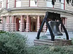 Portland has had two replicas of Philadelphia's original Liberty Bell.[3] The first replica was purchased in 1962 for $8,000.[4] It was constructed at the McShane Bell Foundry in Baltimore and received a 25-year guarantee against breakage.[4][2] The bell arrived in Portland in June 1963, with a damaged base and beam since the sculpture had slipped off its supports. Repairs were made before the replica was paraded through the city on a flatbed truck, then put into storage until Independence Day,[1] when the bell was presented to the city.[5] It was publicly rung for the first time during holiday celebrations and installed in City Hall's rotunda on May 5, 1964.[4][2][6]