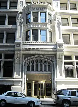 The main elevation is on Liberty Street, which is divided into three bays. The side elevations on Liberty Place and Nassau Street, to the west and east respectively, have five bays each.[15][21] The raised basement contains storefronts facing Liberty and Nassau Streets.[22] The 1st and 2nd floors consist of the base, and are rusticated, with a string course running above the second stories. The 3rd through 5th stories are treated as transitional stories, with lintels on the spandrels above the third and fourth stories (except in the center bay on Liberty Street), and a small cornice above the 5th-story windows.[5][15] On Liberty Street, the 2nd-floor girder above the center bay is raised above the corresponding girders in the side bays.[7] The entrance is beneath the raised girder, through a Tudor arch that contains a set of bronze and glass doors under a bronze transom. The 2nd through 5th stories of the central bay on Liberty Street contains a four-bay-wide, three-sided bay window. The center bay is flanked by four-story-tall paneled buttresses capped by pinnacles.[15][23]