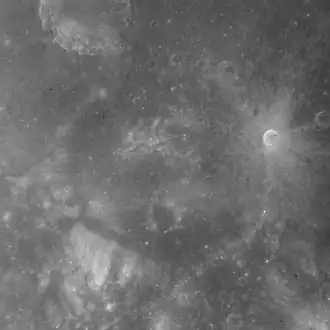 Lick is a lunar impact crater that has been flooded with basaltic lava. This crater was named in memory of James Lick, a Californian philanthropist.[1] The north rim is attached to the smaller, bowl-shaped crater Greaves. Lick lies on the southwest edge of Mare Crisium. Its rim is broken at the north and south ends, and the southwest rim is attached to the crater remnant Lick A. There is a small, flooded crater within the southern part of Lick's inner floor, and several tiny craters mark the interior surface. A small, unnamed crater at the east rim has a bright ray system.