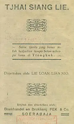 6. ^ "Tjhai Siang Lie : satoe tjerita jang bener telah kedjadian tempo belon sebrapa lama di Tiongkok". WorldCat. Retrieved 27 November 2022.