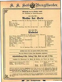 At the end of October 1894, shortly after its completion, Schnitzler submitted Liebelei to the Burgtheater, and it was accepted for performance the following January.[5] The premiere took place less than a year after the play's completion on 9 October 1895, with Schnitzler's lover Adele Sandrock playing Christine.