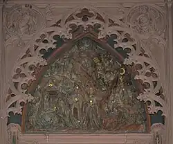 In 1344 the chapel was expanded to a Gothic hall church of three naves.[2] A document about its consecration mentions two altars. From 1415, the south facade was transformed, including a tympanum showing the Adoration of the Magi made by the workshop of Madern Gerthener.[3][4] In 1453 the town council permitted to change an adjacent tower of the fortification to a bell tower. From 1506 to 1509 the church was once more expanded, by Jörg Östereicher.[3] The church remained Catholic, part of the Diocese of Mainz, even when the Reformation was introduced in Frankfurt in 1533.[1]