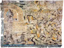 The Lienzo de Quauhquechollan was made sometime in the 1530s;[1] it consists of 15 individual pieces of painted cotton stitched together to form a large map.[9][10] The pieces are of differing sizes and manufacture and some of them are reused.[11] The complete Lienzo de Quauhquechollan measures 3.25 by 2.35 metres (10.7 by 7.7 ft) (width by height).[1] The Lienzo was executed in a central Mexican style using indigenous artistic conventions to portray a mixture of Nahua and Spanish subjects.[2] The main focus of the map lies within the borders of modern Guatemala, specifically the area around Chimaltenango and Santiago de los Caballeros de Guatemala, the colonial capital.[2] The Lienzo concentrates upon the role of the Quauhquechollan allies in the conquest, their travels and the battles they took part in.[2] It was executed by more than one artist, as evidenced by stylistic differences in the painting.[12]